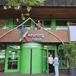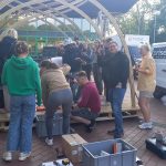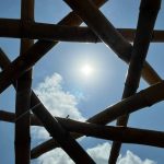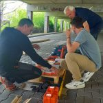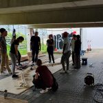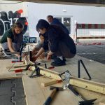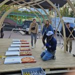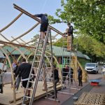 07. Mai 2023: Chris und Rabea besuchen die Hochschule Rhein-Main in Wiesbaden, um die dortige Konstruktion eines Bambus-Pavillons live mitzuerleben. Im Rahmen einer Seminarreihe zum Klimagerechten Bauen von Prof. Sascha Luippold, den Lehrbeauftragten Andrés Bäppler und Christoph Diekhans, sowie Dr. Oliver Bletz-Mühldorfer vom Labor für Holzbau der HSRM, wurde im Wintersemester 2022/23 das Konzept für den Pavillon entwickelt und im Sommersemester in einem Design-Build-Workshop praktisch umgesetzt. Der „Bambillon“ soll im Juni auf der European Bamboo Expo in Dortmund aufgebaut werden und darf von GROW Colourful Ghana e.V. als Infostand für das Bambusprojekt in Ghana genutzt werden.