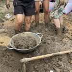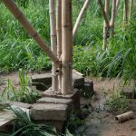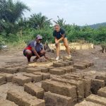 Für den Bau der Komposttoilette wird zuerst das Fundament vorbereitet. Beim „Lehmstampfen“ wird Lehm mit Sand und Reishülsen als Fasermaterial gemischt. Aus dieser Mischung werden die Lehmziegel hergestellt, aus denen im weiteren Schritt die Wände des geplanten Achteck-Toilettenhäuschens gemauert werden. Ein kleiner Vorbau für das Handwaschbecken, sowie die Dachkonstruktion werden aus Bambus gefertigt.