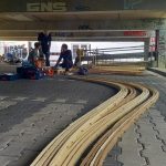 Nach vorhergegangener Behandlung mit Borsalzlösung im Tauchbecken geht es an die Konstruktion der Stützpfeiler für das Hallendach. Dies besteht aus fünf Rahmen, die am Boden montiert und anschließend in Betonfundamenten aufgestellt werden.